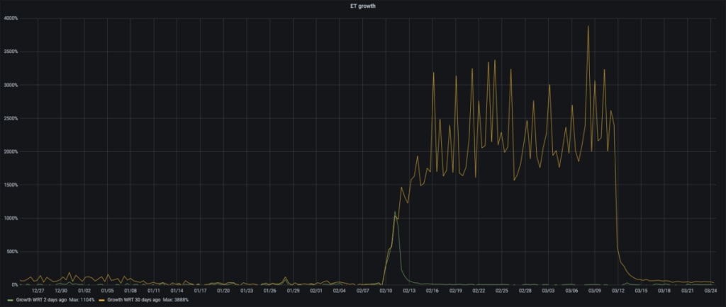 When the government began censoring the social media sites in February, we witnessed a rapid uptick in the number of connetions to Proton VPN from Ethiopia. The graph below shows the percentage increase in connections above normal levels. Connections to our servers grew by nearly 4,000% after the blocks took effect.