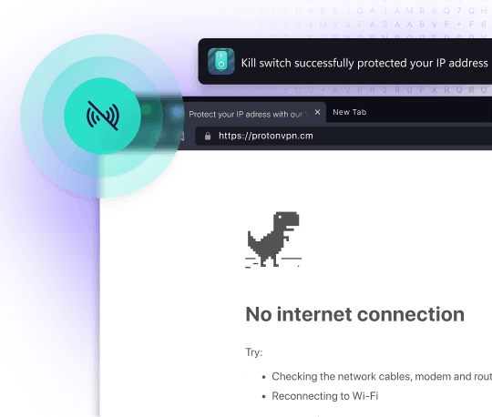 Behalte die Kontrolle darüber, wer deine IP-Adresse jederzeit sehen kann, mit dem Proton VPN Notaus-Schalter, der dich auch dann schützt, wenn deine Internetverbindung unerwartet unterbrochen wird.
