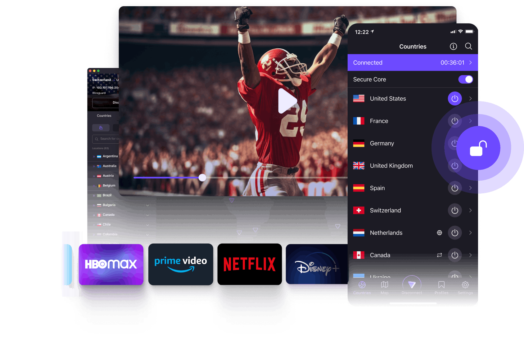 Mit dem globalen Streaming-Server-Netzwerk von Proton VPN streamst du Sport on demand und live von überall auf der Welt privat und ohne Pufferung oder Drosselung.