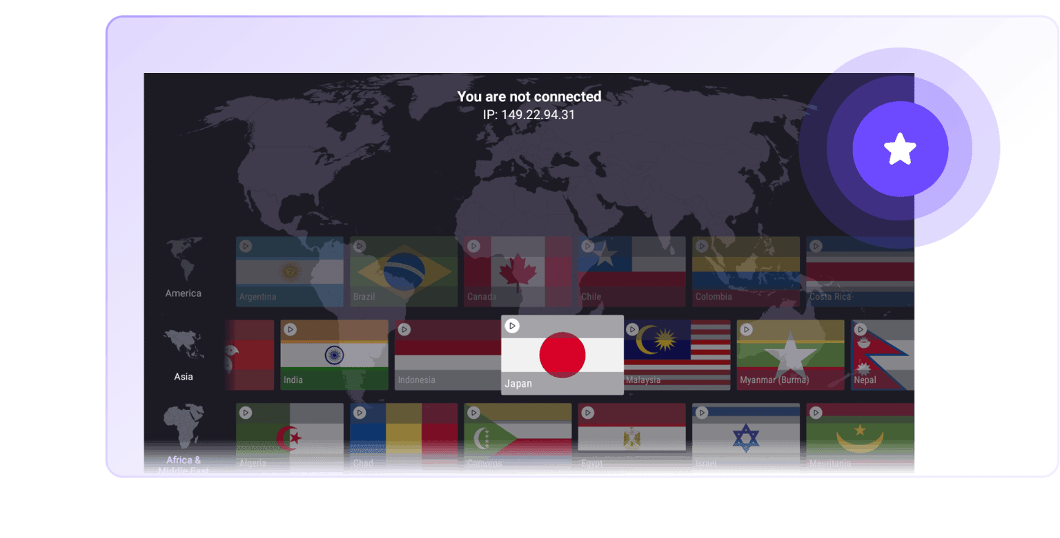 Simply select a country you wish to stream from and our Android TV app will automatically connect you to the fastest VPN server in that country.