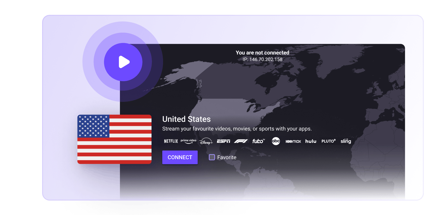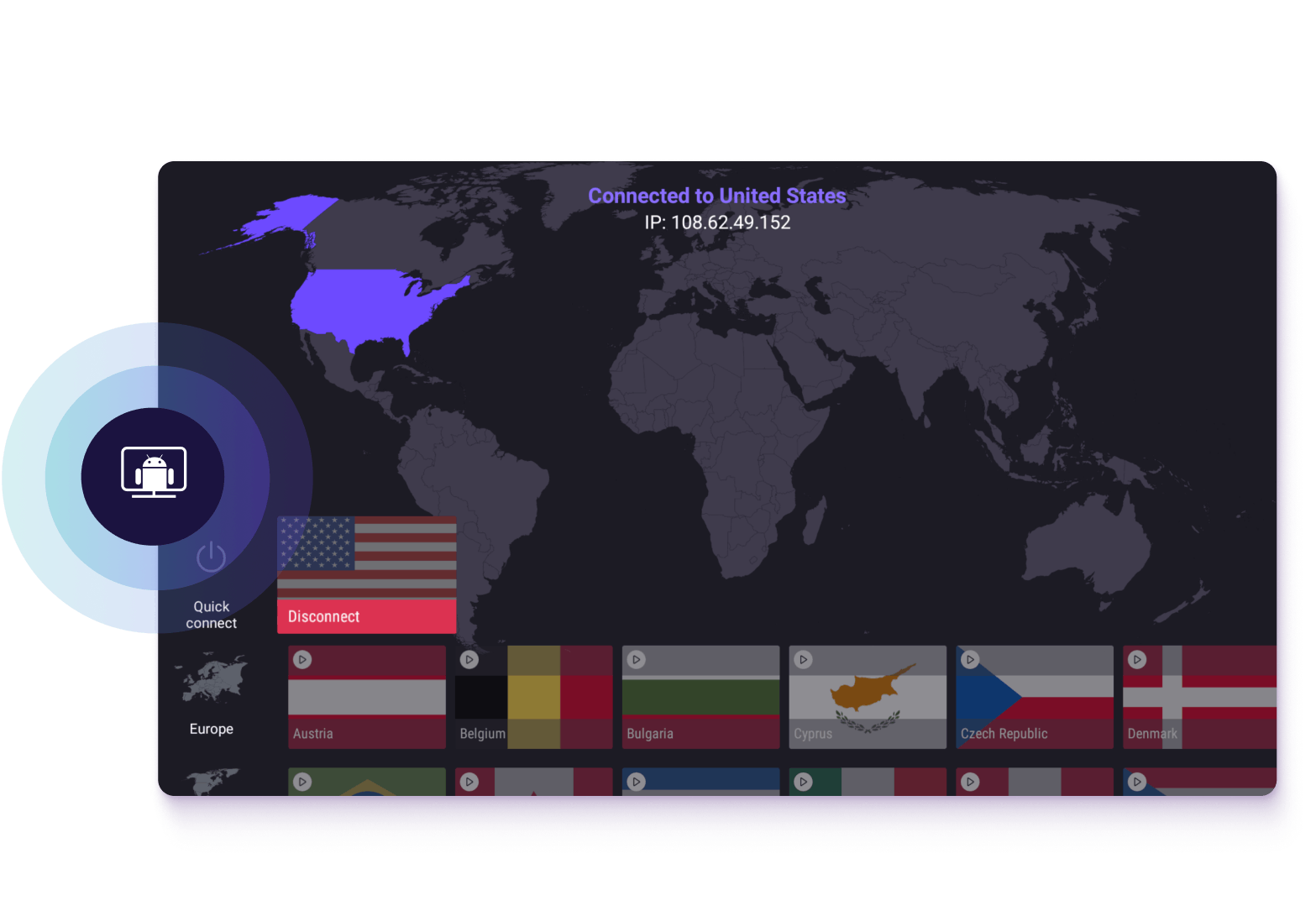 Simply select a country you wish to stream from and our Android TV app will automatically connect you to the fastest VPN server in that country.