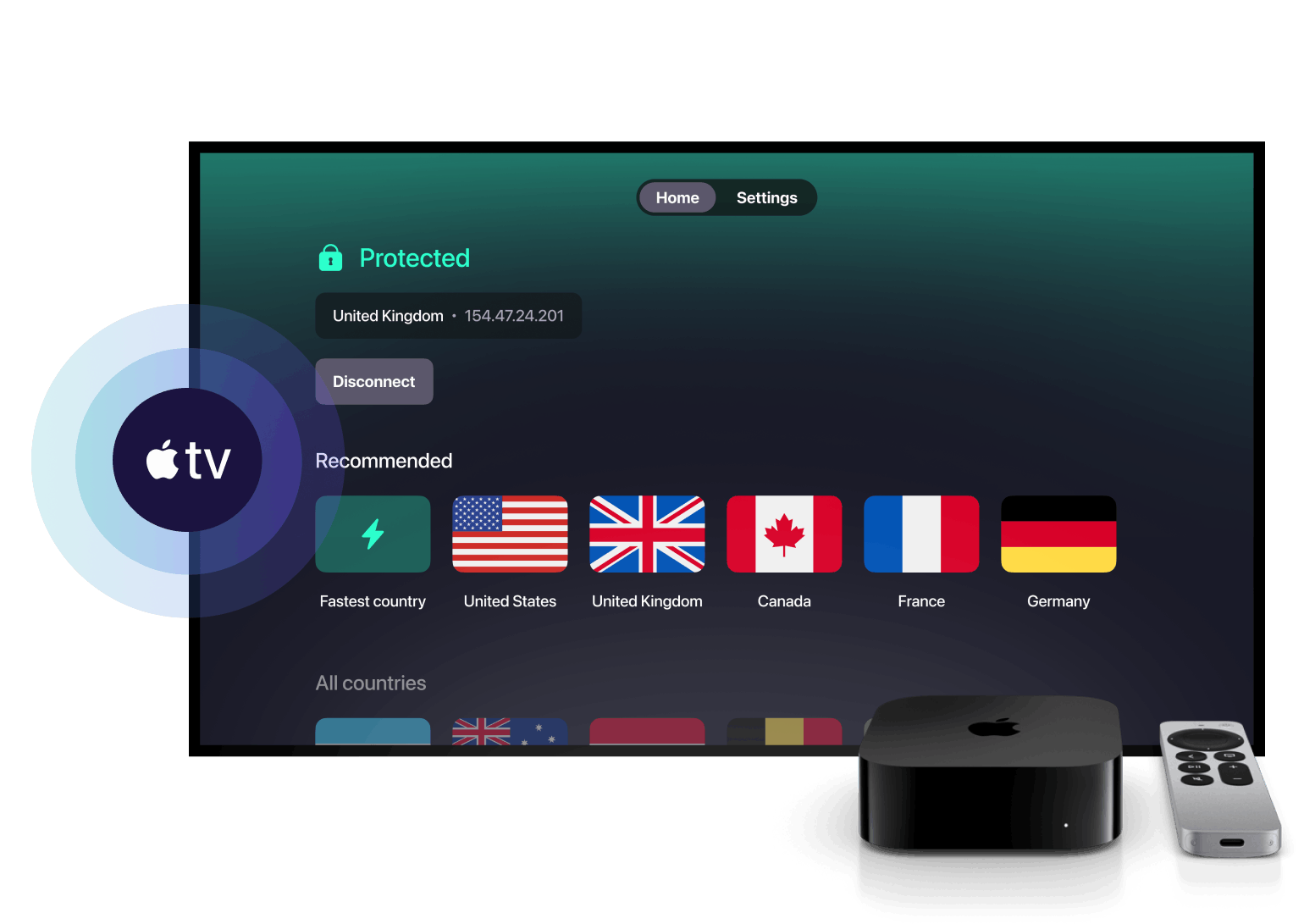 Use your the Apple TV remote or any other supported remote(new window) to select a country, or select Fastest country to automatically connect to the fastest server for your location.
