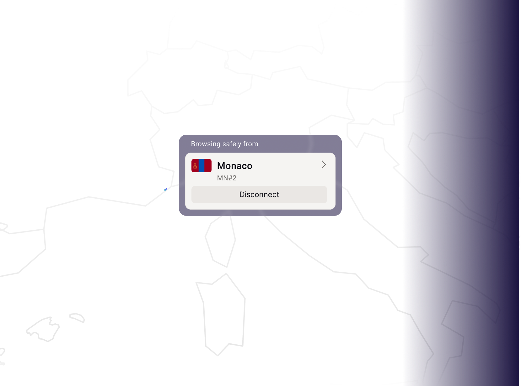 Conéctese a uno de nuestros servidores VPN monegascos seguros para navegar por internet con una dirección IP monegasca. Los sitios web y los servicios en línea a los que acceda verán su tráfico como si proviniera de Mónaco.