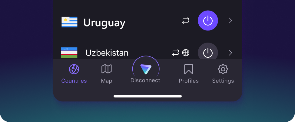 Conéctese a uno de nuestros servidores VPN seguros en Uruguay para navegar por internet con una dirección IP uruguaya. Los sitios web y servicios en línea a los que acceda verán su tráfico como si proviniera de Uruguay.