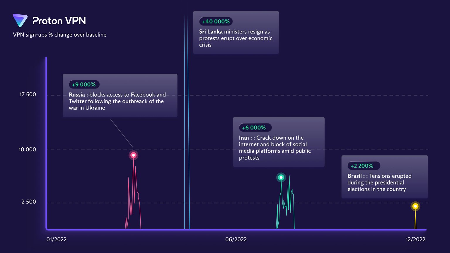 Las VPN son herramientas esenciales para combatir la censura en internet. En Proton VPN, vemos regularmente picos de registros tras grandes eventos geopolíticos en todo el mundo, ya sean protestas, elecciones disputadas o medidas represivas gubernamentales. Para ver cómo la gente en todo el mundo lucha contra la censura en internet, hemos comenzado a documentar todos los picos significativos en el uso de Proton VPN.