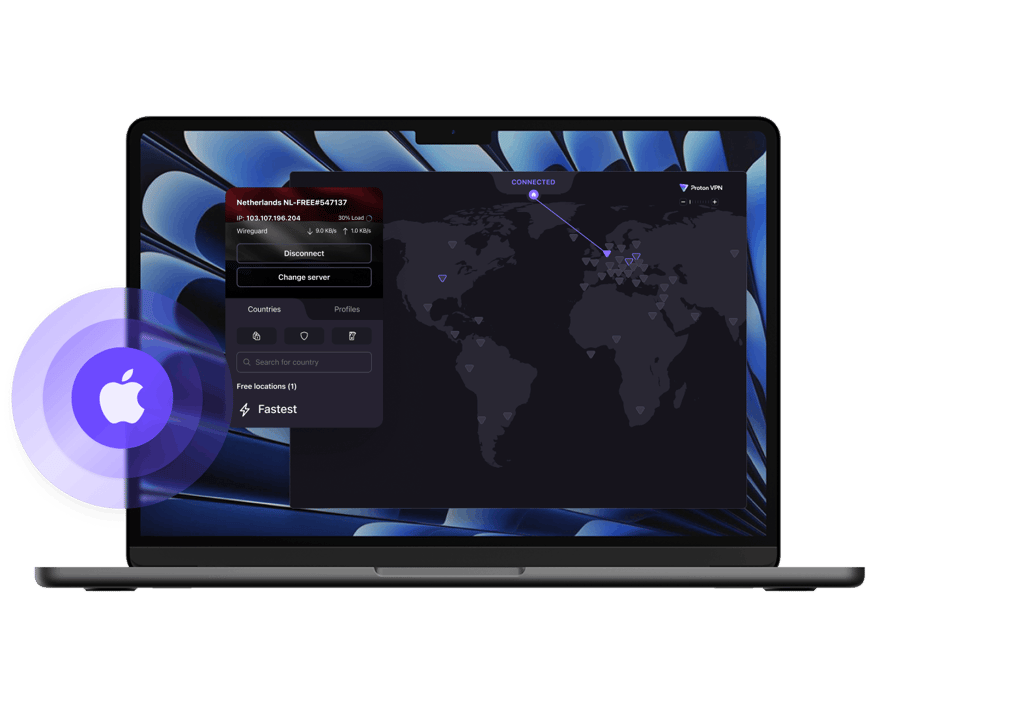 Proposé par les scientifiques à l'origine de Proton Mail, Proton VPN est gratuit, sans limites et optimisé pour fonctionner parfaitement sur votre Mac.