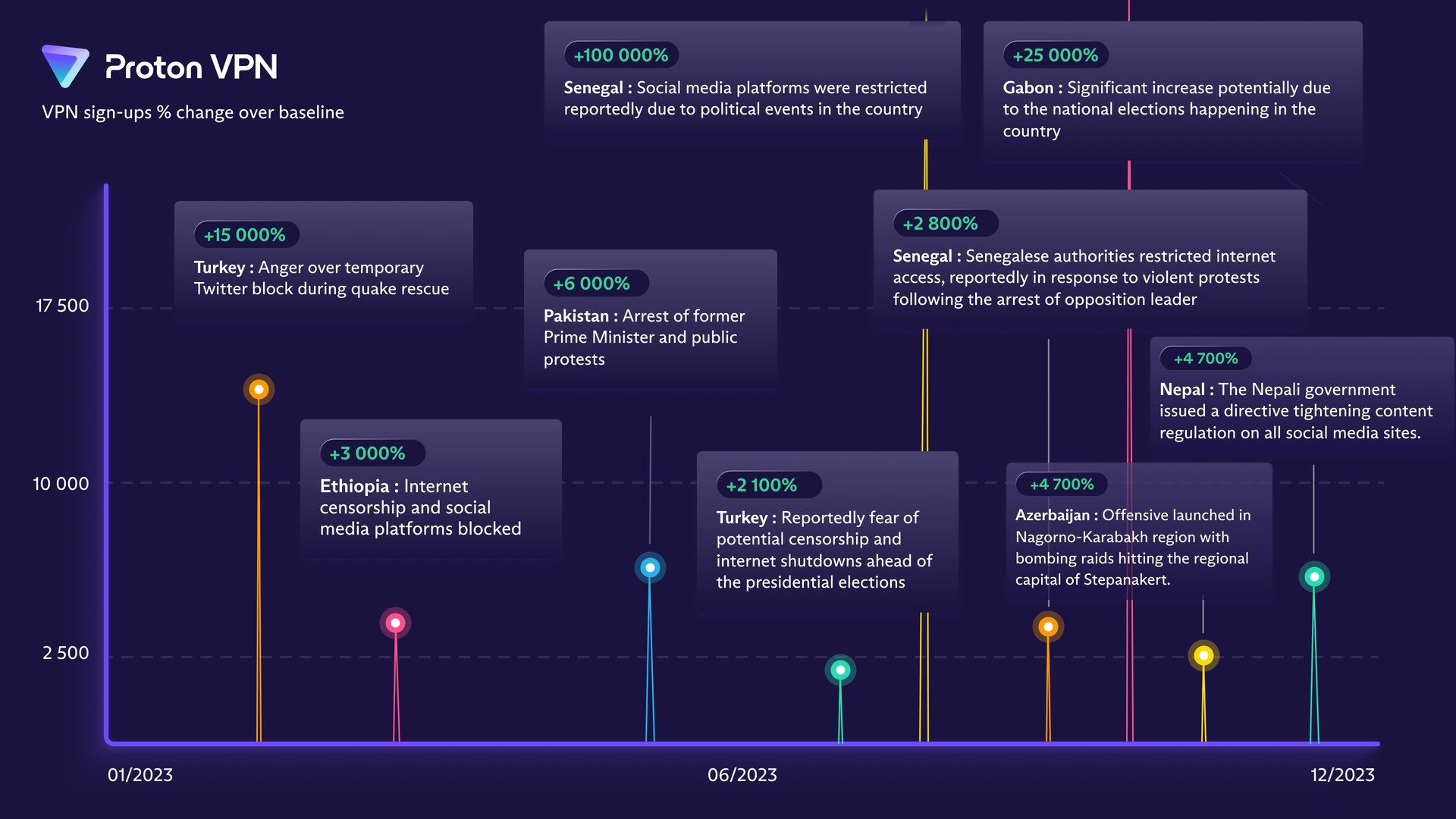 Les VPN sont des outils essentiels pour lutter contre la censure d'internet. Chez Proton VPN, nous constatons régulièrement des pics d'inscription suite à des événements géopolitiques majeurs dans le monde, qu'il s'agisse de manifestations, d'élections contestées ou de répressions gouvernementales. Pour voir de quelle manière la censure sur internet est combattue dans le monde, nous avons commencé à documenter tous les pics significatifs d'utilisation de Proton VPN.