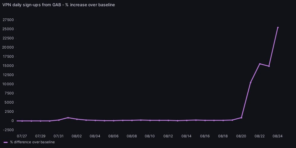 Les inscriptions au Gabon continuent d'augmenter pour le quatrième jour consécutif, le chiffre quotidien étant actuellement supérieur de 25 000 % au niveau de référence. Aucun motif clair n'a encore pu être dégagé, mais il est possible que les utilisateurs s'inscrivent en prévision des élections nationales du 26 août 2023.