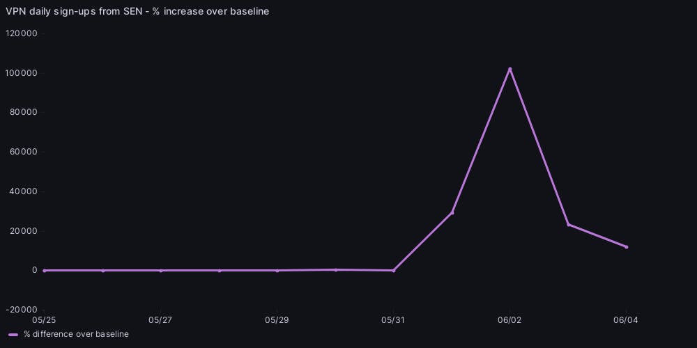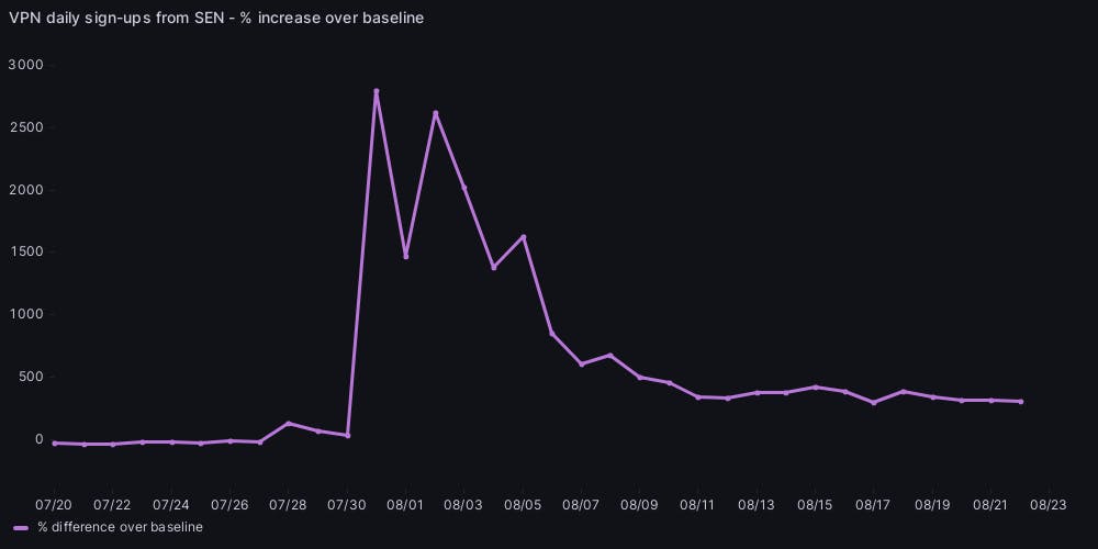 Manifestations publiques et restrictions d'accès à internet - Les autorités sénégalaises ont restreint l'accès à internet, en réponse, semble-t-il, à de violentes manifestations qui ont éclaté à la suite de l'arrestation du leader de l'opposition, Ousmane Sonko. TikTok a ensuite été bloqué le 2 août, ce qui coïncide avec un deuxième pic, dans un contexte de manifestations persistantes.
