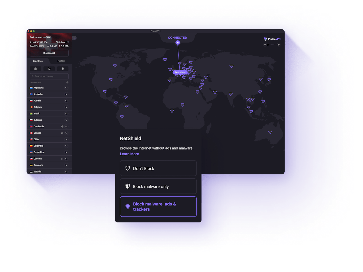 But if you upgrade to a paid plan, you’ll get our NetShield Ad-blocker, which blocks ads, trackers, and malware.