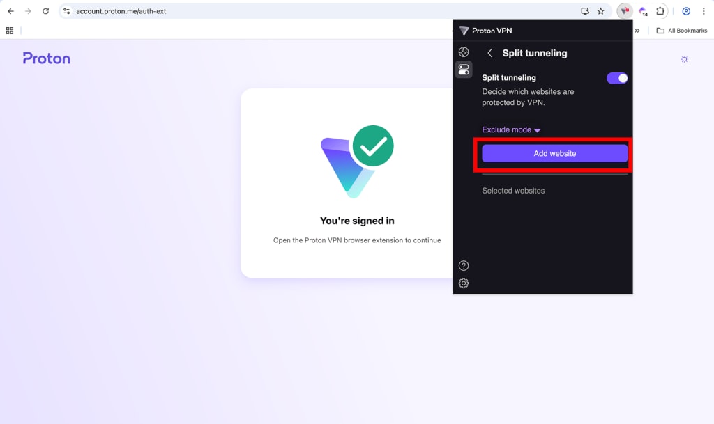 By default, split tunneling Excludes the websites you add from your VPN connection. All other websites are protected by VPN as normal.