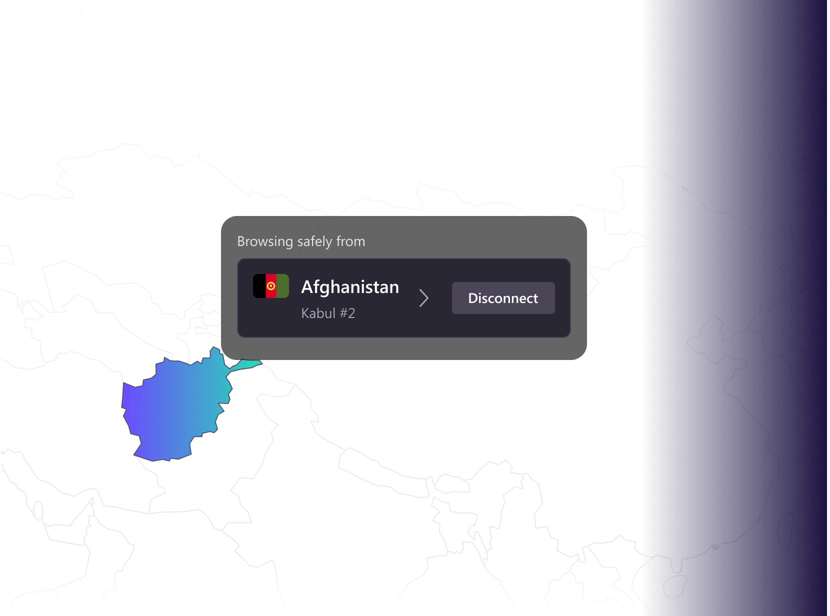 Hubungkan ke server Afganistan untuk menjelajahi internet dengan kemudahan, privasi, dan keamanan.