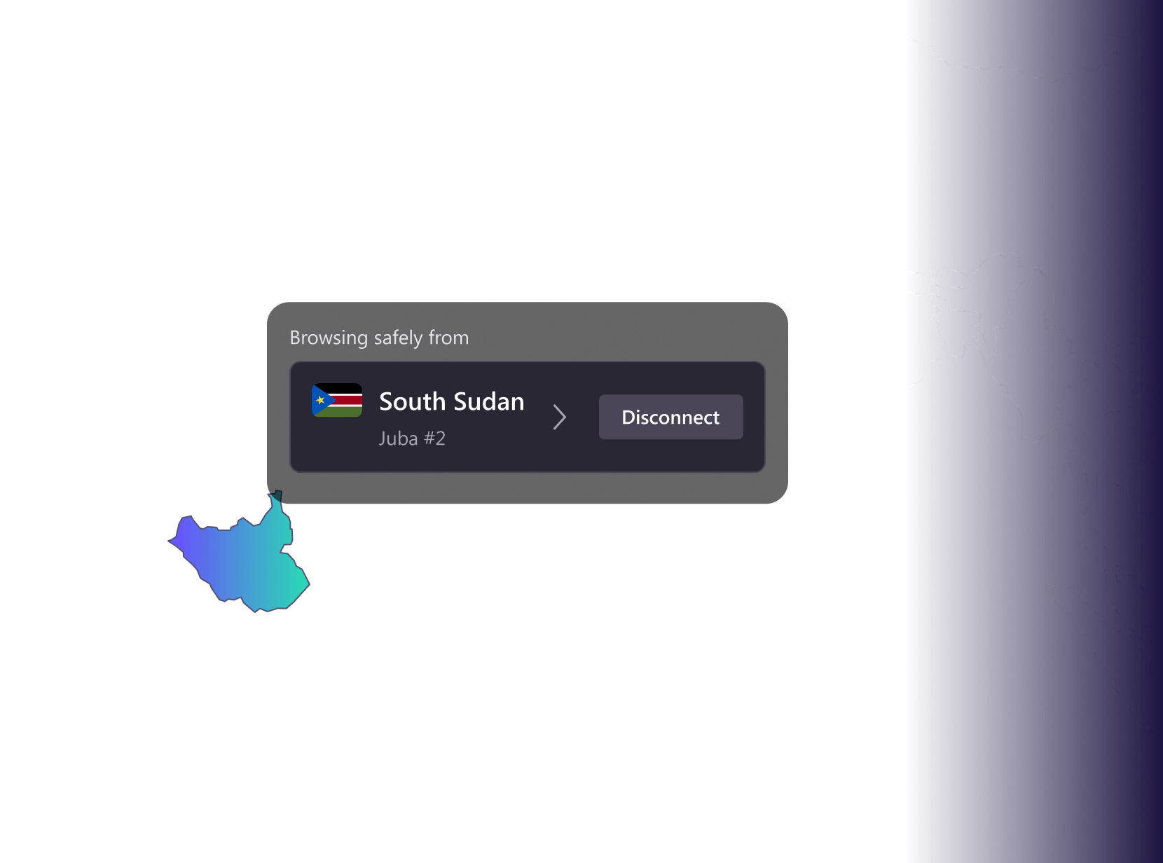 Hubungkan ke server Sudan Selatan untuk menjelajahi internet dengan kemudahan, privasi, dan keamanan.