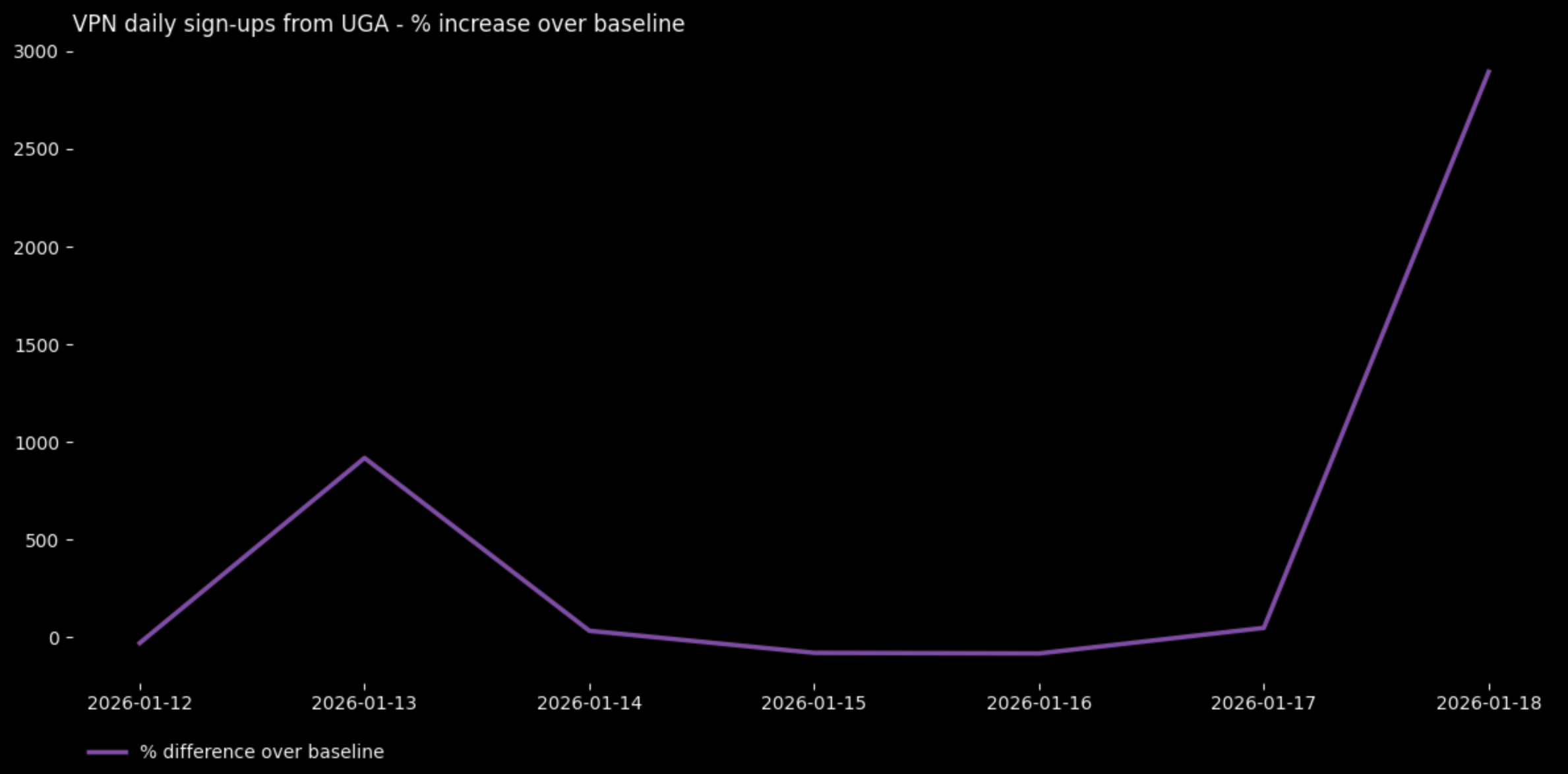 Presidential elections: signup spike in Uganda as the government ordered a suspension of public internet access prior to January 15th election, resulting in a +8000% hourly increase in signups between 2pm and 3pm GMT. During the last election in the country in 2021, which saw widespread protests with dozens killed, the internet was cut for at least a week.