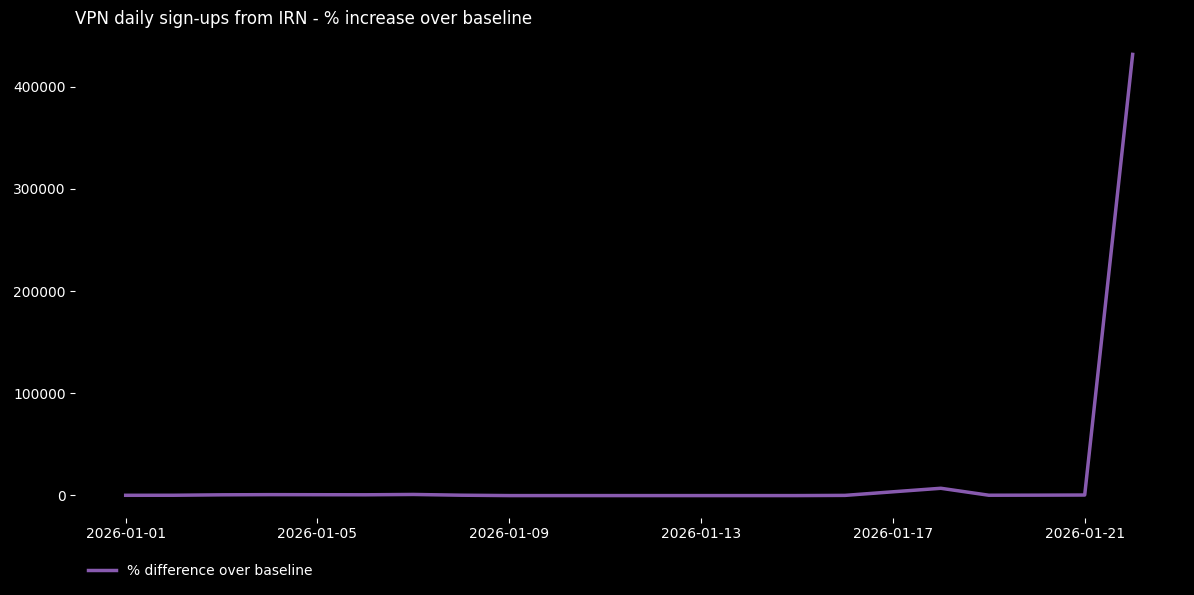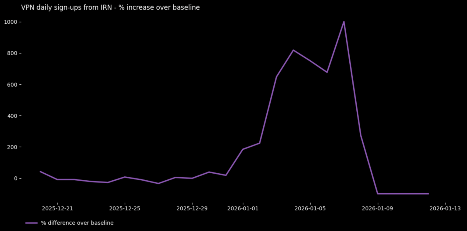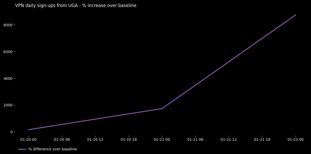 大統領選挙:ウガンダでは、政府が1月15日の選挙に先立ち公共インターネットアクセスの停止を命じたため、登録が急増しました。その結果、GMT午後2時から3時の間に登録数が1時間あたり+8000%増加しました。 数十人が死亡する大規模な抗議活動が発生した2021年の同国の前回選挙では、インターネットが少なくとも1週間遮断されました。