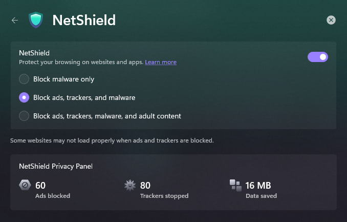 If you turn on Block ads, malware, and trackers, select the NetShield tab to see the NetShield Privacy Panel.