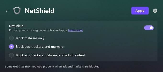 2. Select the level of protection you’d like and click Apply. (You can also toggle the NetShield switch off here, if you prefer.)