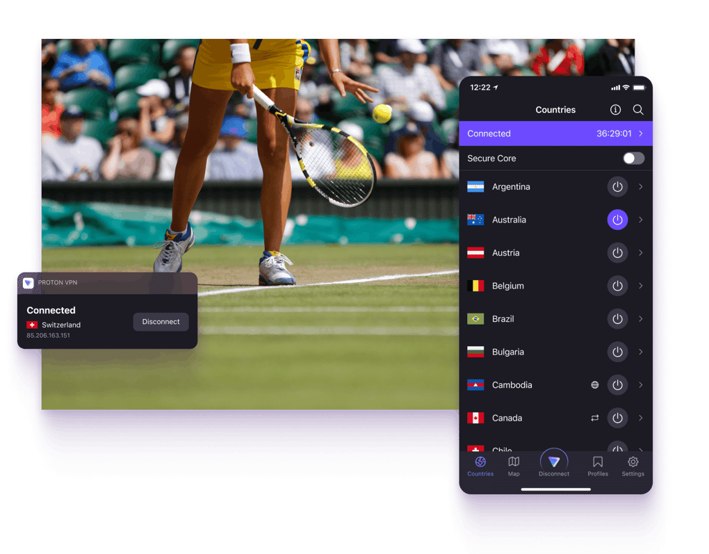 With serves topping 120 miles per hour, you can’t afford to have video buffering or bandwidth throttling during Wimbledon. A VPN like Proton VPN gives you a direct connection to servers near your streaming service, no matter where you are.