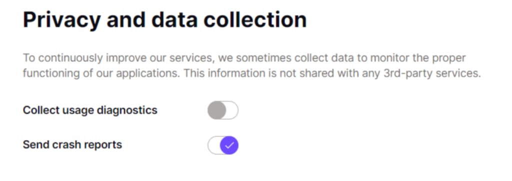 However, you cannot share usage statistics from Proton VPN unless you have enabled Collect usage diagnostics in your Proton Account.