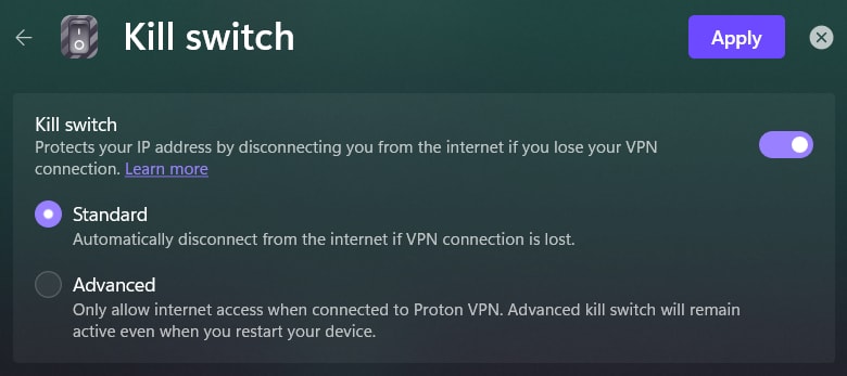 2. Toggle the Kill switch button on. You can now choose between Standard kill switch and Advanced kill switch. Click Apply when you’re done.