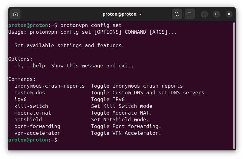 You can configure advanced VPN settings using the protonvpn config set command. For a full list of these commands currently supported by the CLI, run: