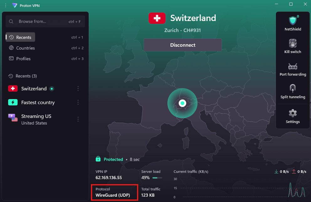 1. Open the Proton VPN app and connect to any server. Make a note of which VPN protocol you are using.