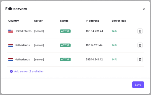 - To delete servers from a gateway, click the trash can icon next to that server. To continue, click Save.