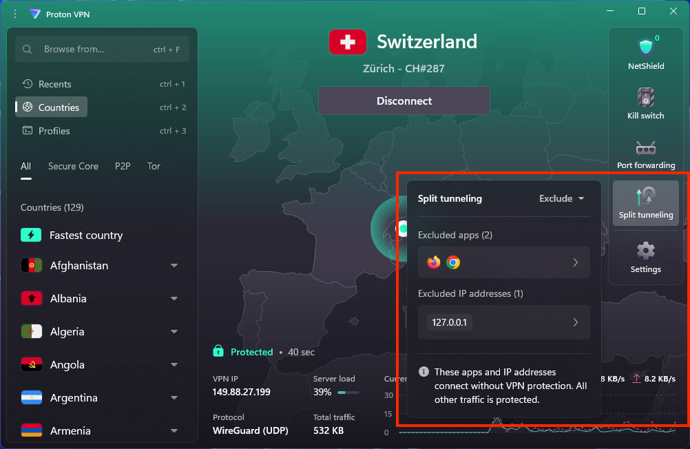 Split tunneling allows you to route some connections through the VPN tunnel while excluding others. It’s a premium feature, available to everyone with a paid Proton VPN plan.