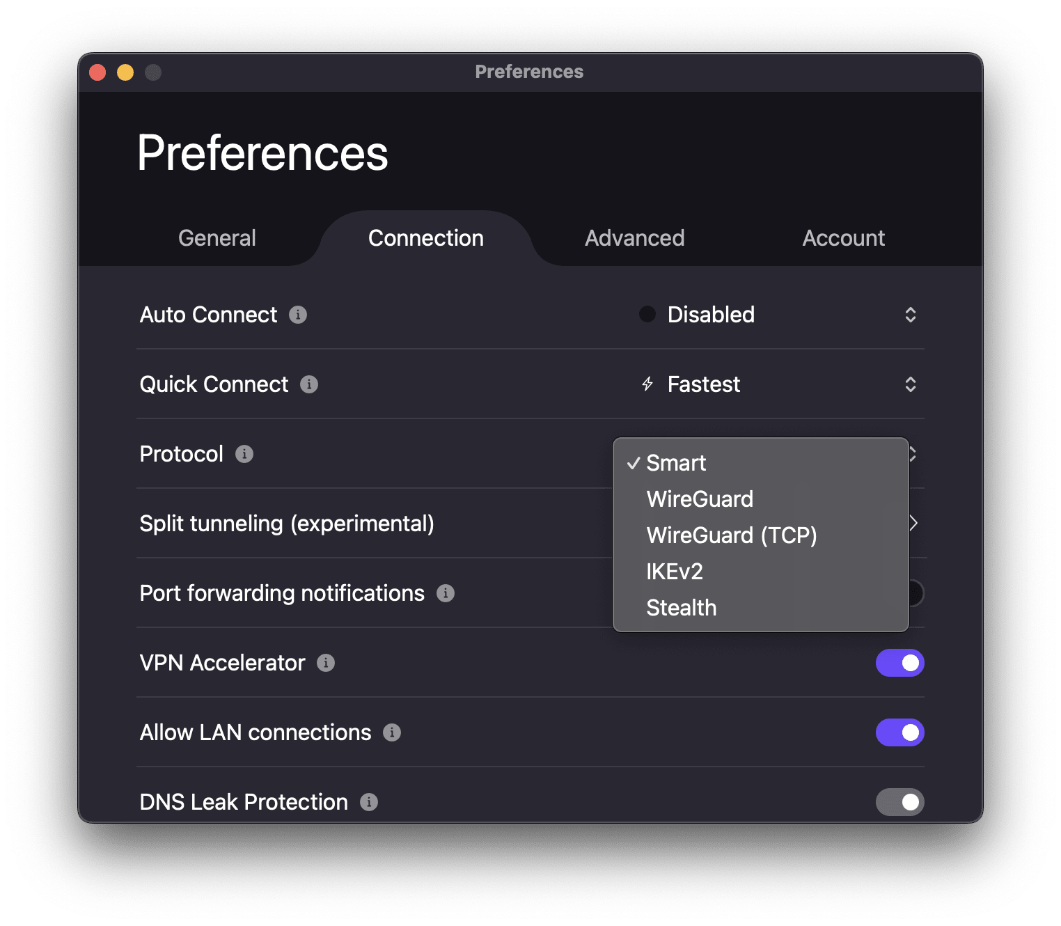To change VPN protocols, open the app and go to the macOS menu bar → ProtonVPN → Preferences → Connection tab → Protocol and select Smart, WireGuard, WireGuard (TCP), IKEv2, or Stealth from the dropdown menu.