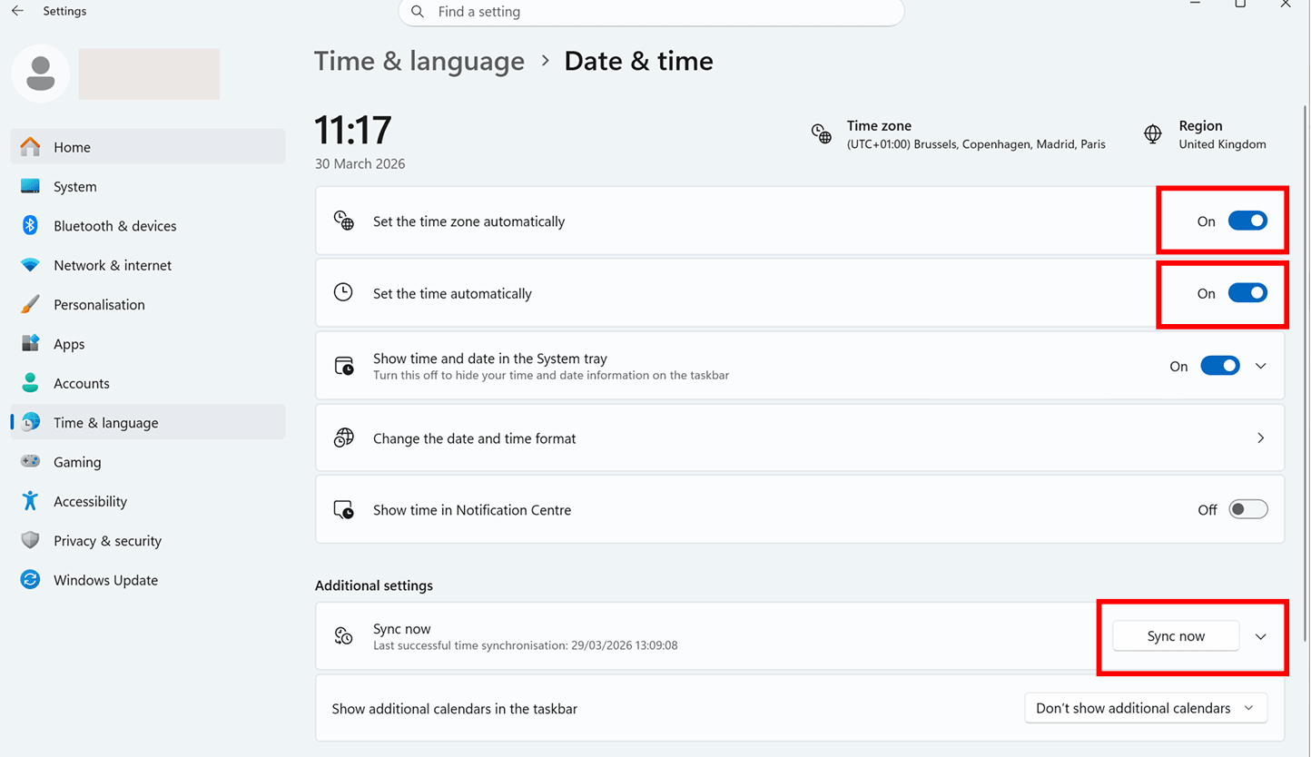 - Set time automatically is On.