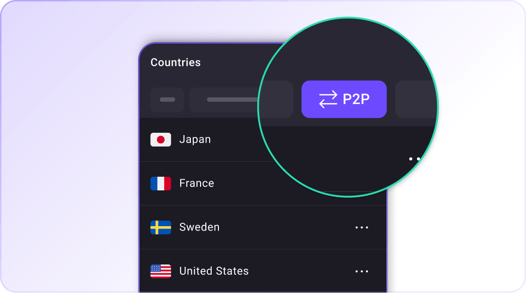 เรามีเซิร์ฟเวอร์ที่ปรับแต่งมาเพื่อรองรับทราฟฟิก Torrent ในเขตอำนาจศาลที่อนุญาตให้มีการแชร์ไฟล์แบบ P2P เซิร์ฟเวอร์เหล่านี้จะมีไอคอน ⇄ กำกับอยู่ ไม่ว่าจะอยู่ที่ใดในโลก ก็มีเซิร์ฟเวอร์ P2P อยู่ใกล้เคียงเพื่อให้ดาวน์โหลดไฟล์ได้อย่างปลอดภัยและรวดเร็ว