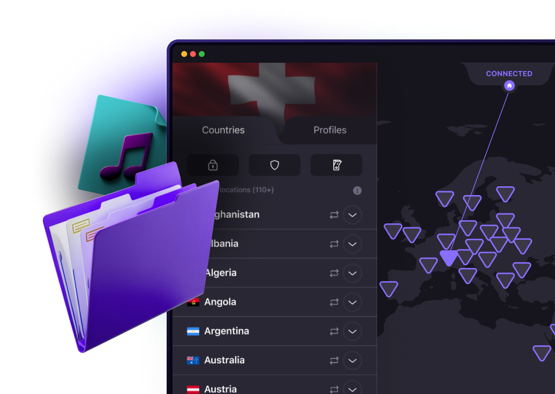 ดาวน์โหลดแอปและเข้าสู่ระบบ Proton VPN จากนั้นเชื่อมต่อกับ เซิร์ฟเวอร์ Plus ที่มีการรองรับ P2P (ตามที่แสดงด้วยไอคอนลูกศรสองหัว) ในประเทศใดก็ได้จากกว่า 120 ประเทศ