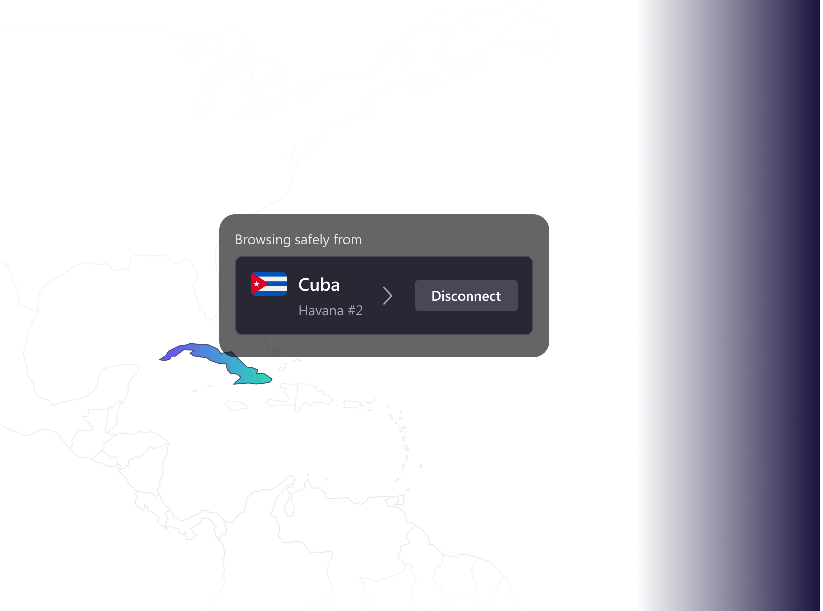 ท่องอินเทอร์เน็ตด้วยที่อยู่ IP คิวบาไม่ว่าจะอยู่ที่ใดในโลก โดยเชื่อมต่อกับหนึ่งในเซิร์ฟเวอร์ VPN คิวบาที่ปลอดภัย สำหรับผู้ที่ตรวจสอบเครือข่าย ทราฟฟิกเว็บจะปรากฏเหมือนกับว่าอยู่ในคิวบา