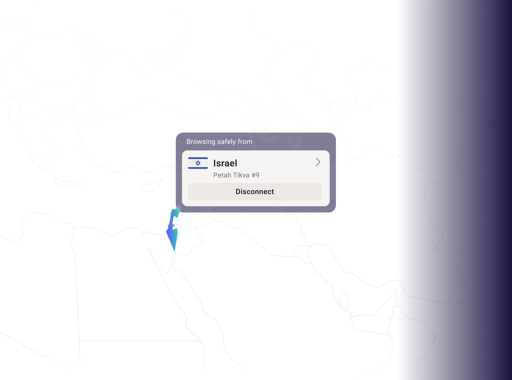 เลือกอิสราเอลบนแผนที่หรือค้นหาในรายชื่อประเทศเพื่อสร้างการเชื่อมต่อ VPN ที่ปลอดภัย