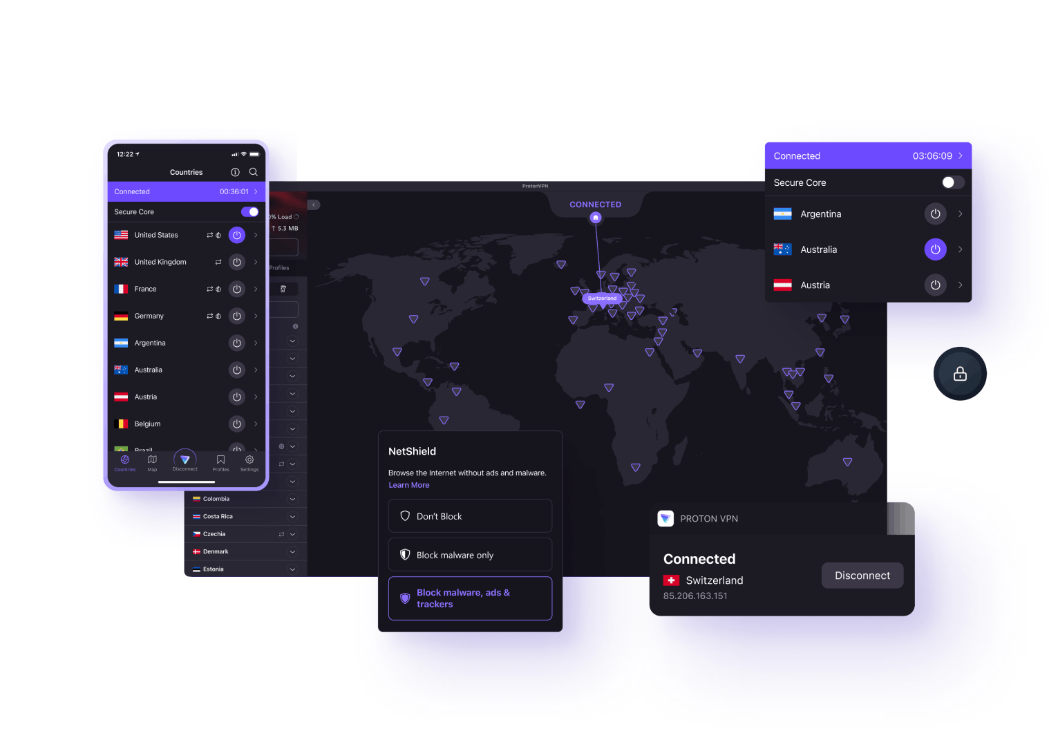 สำหรับผู้ใช้ที่มองหาความเป็นส่วนตัวมากขึ้น เรามีการป้องกัน Secure Core ซึ่งจะกำหนดเส้นทางทราฟฟิกผ่านเซิร์ฟเวอร์ VPN ในประเทศที่มีกฎหมายคุ้มครองข้อมูลที่เข้มงวดก่อนที่จะเชื่อมต่อกับเซิร์ฟเวอร์ VPN อื่นและไปยังเว็บไซต์ที่ต้องการ