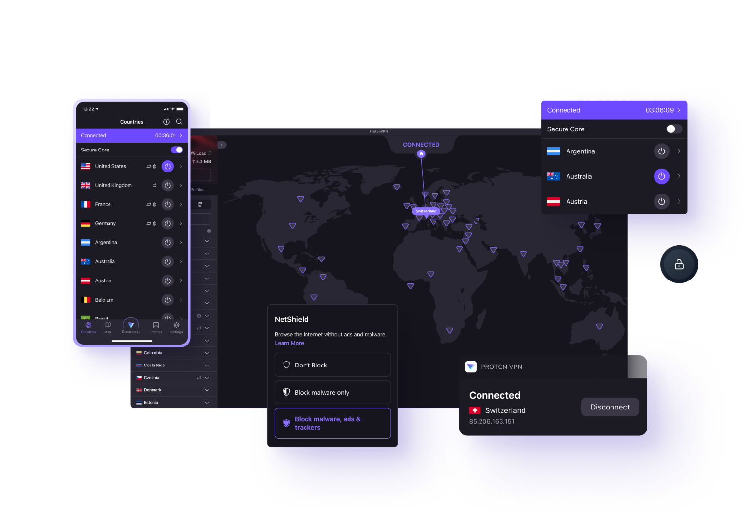 ท่องเว็บได้ไม่จำกัดด้วย Free plan ของ Proton VPN เราเป็น VPN ฟรีรายเดียวที่รักษากิจกรรมออนไลน์ให้เป็นส่วนตัวโดยไม่มีบันทึก โฆษณา หรือมัลแวร์