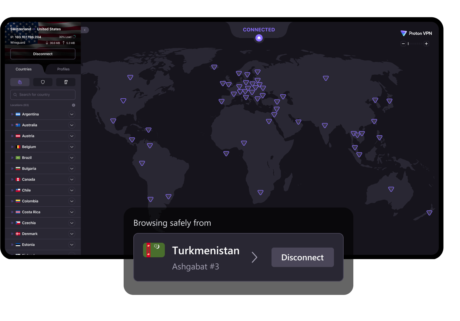 Proton VPN ให้บริการเซิร์ฟเวอร์ VPN ความเร็วสูง 10 Gbps ในเติร์กเมนิสถาน การใช้ VPN ในเติร์กเมนิสถานจะช่วยให้หลีกเลี่ยงการจำกัดเนื้อหา ปกป้องความเป็นส่วนตัวออนไลน์ และหลบหนีการสอดแนมของรัฐบาลได้