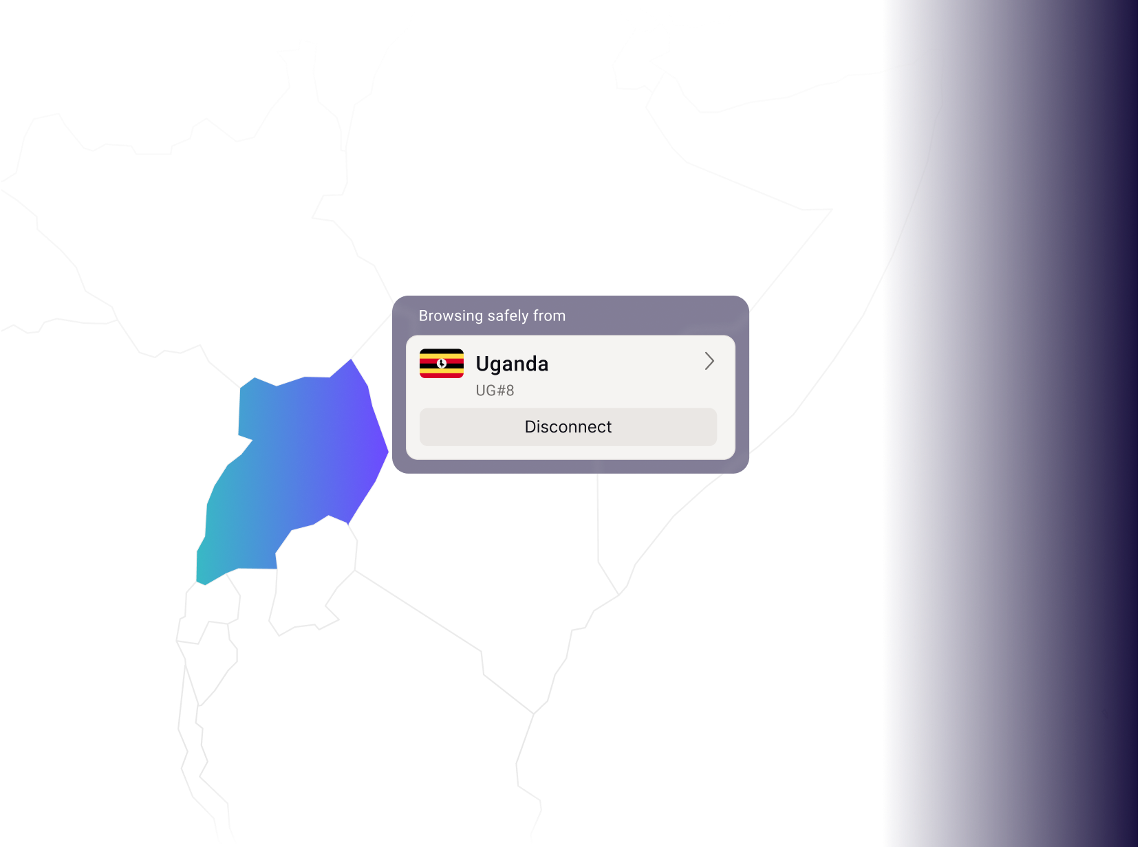 เชื่อมต่อกับเซิร์ฟเวอร์ VPN ยูกันดาที่ปลอดภัยเพื่อท่องอินเทอร์เน็ตด้วยที่อยู่ IP ของยูกันดา เว็บไซต์และบริการออนไลน์ที่เข้าถึงจะเห็นทราฟฟิกว่ามาจากยูกันดา