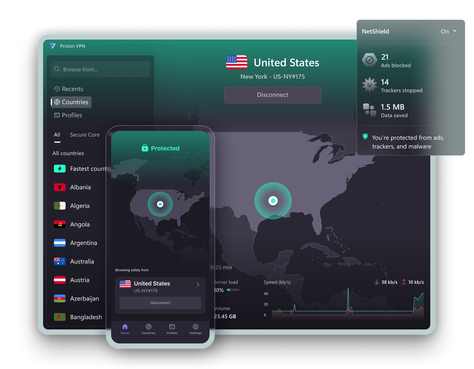 ซ่อนที่อยู่ IP และท่องเว็บอย่างเป็นส่วนตัวโดยเชื่อมต่อกับเซิร์ฟเวอร์ความเร็วสูงในสหรัฐอเมริกา ด้วย Proton VPN คุณสามารถเข้าถึงอินเทอร์เน็ตได้อย่างปลอดภัยโดยไม่มีการเซ็นเซอร์และสตรีมได้โดยไม่สะดุด