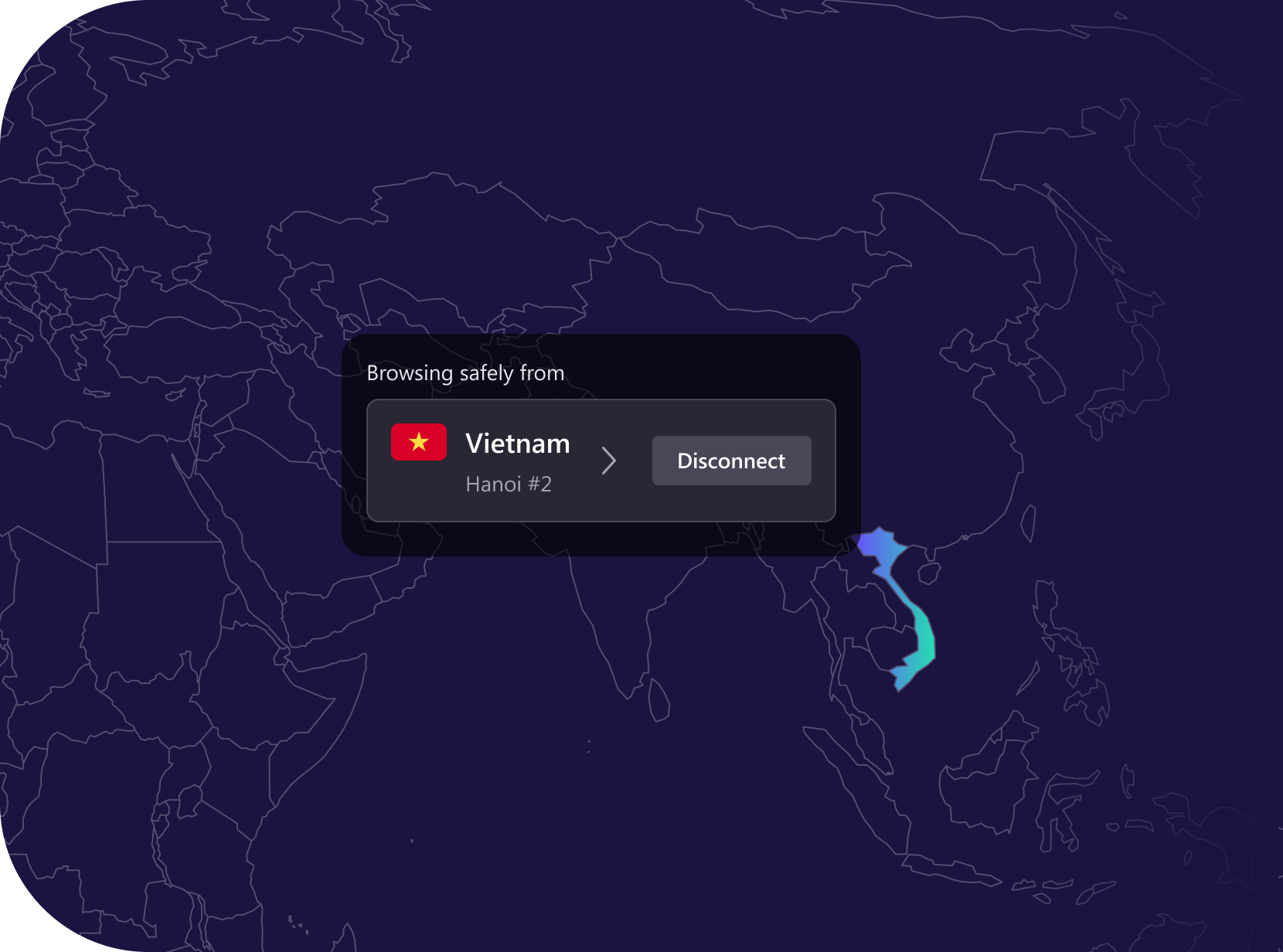 ท่องอินเทอร์เน็ตด้วยที่อยู่ IP เวียดนามไม่ว่าจะอยู่ที่ใดในโลก โดยเชื่อมต่อกับหนึ่งในเซิร์ฟเวอร์ VPN เวียดนามที่ปลอดภัย สำหรับผู้ที่ทำการตรวจสอบเครือข่าย ทราฟฟิกเว็บจะปรากฏเสมือนว่าอยู่ในเวียดนาม