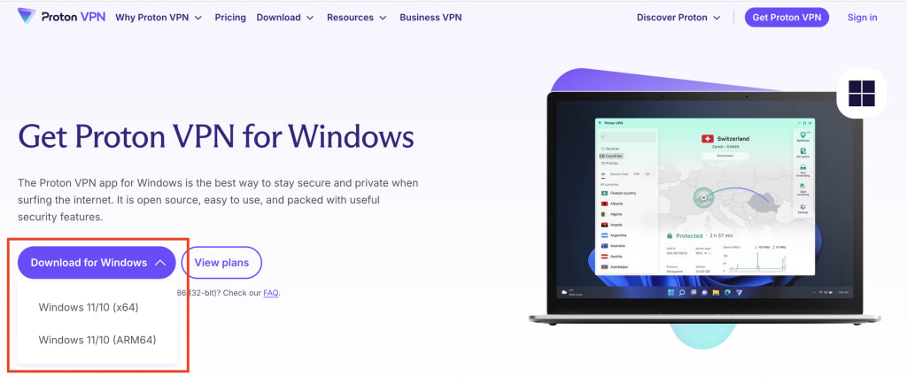 1. Visit our Proton VPN for Windows page, click the Download for Windows button and select the version of Windows 11 or 10 that you’re running (x64 or ARM64). If in doubt. most people are running x86 systems.