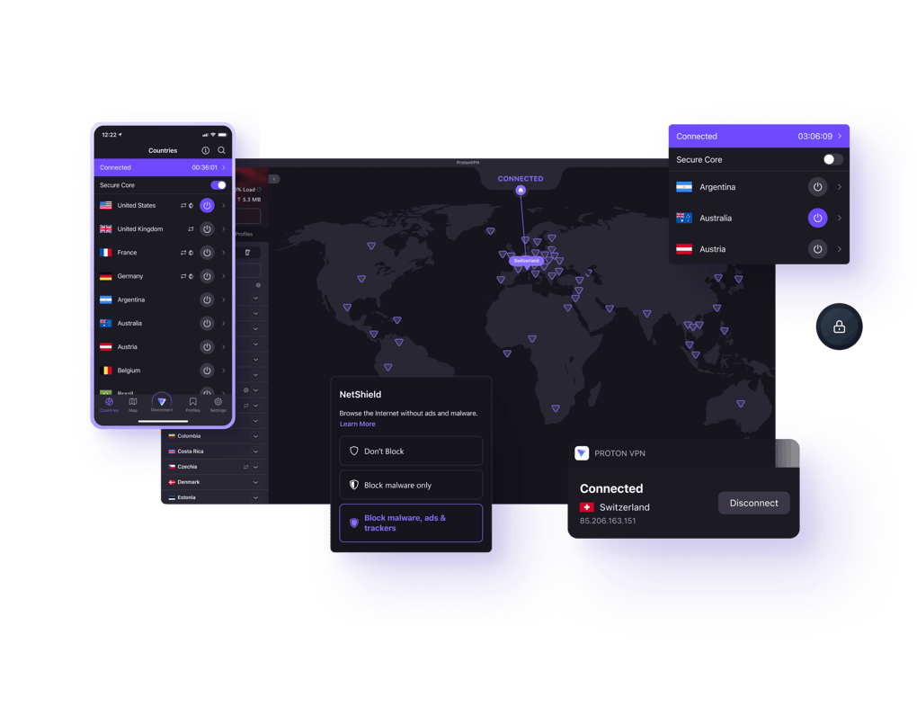 Using Proton VPN lets you protect your privacy with multiple layers of security. We use only VPN protocols with no known vulnerabilities at their highest encryption settings to protect your privacy. If your VPN connection is lost for any reason, our built-in kill switch will automatically block all network traffic, keeping your device’s true IP address private even when the VPN is disconnected.