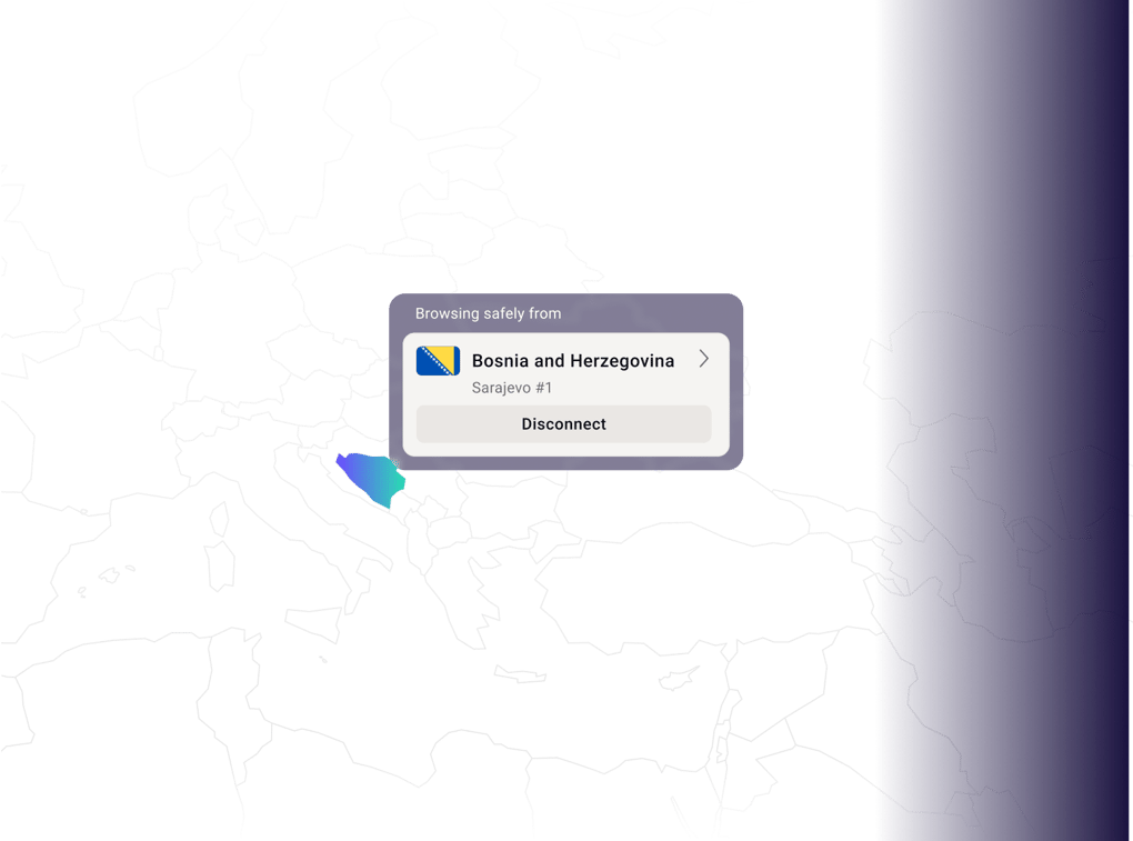 網際網路應該對所有人免費開放且易於存取。 透過使用 Proton VPN,您可以連線至我們位於波士尼亞與赫塞哥維納的快速、可靠且安全的伺服器,並使用波士尼亞 IP 位址瀏覽網際網路。