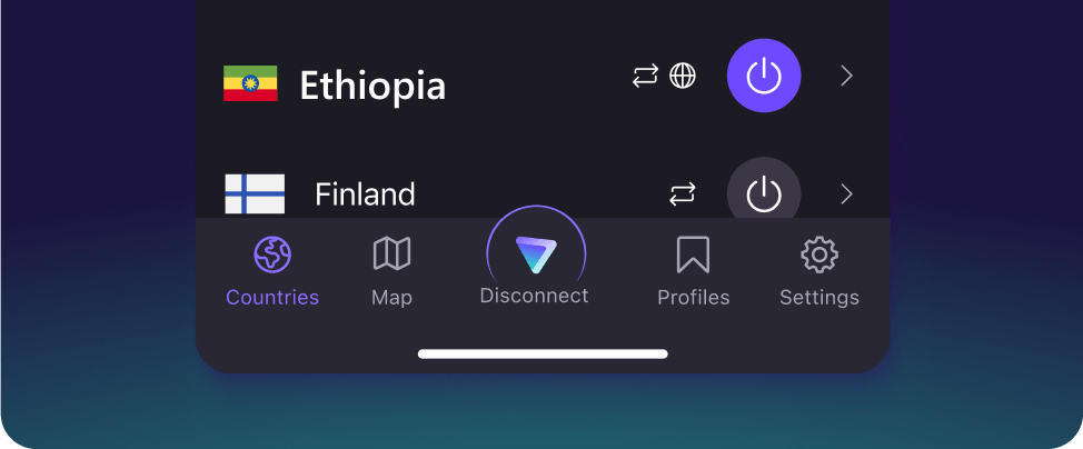 如果您與衣索比亞 VPN 伺服器的連線中斷,我們的 緊急終止開關 會透過封鎖您裝置的傳入和傳出流量來保護您。 此重要功能可確保在伺服器故障時,您的資料和真實 IP 位址不會遭到入侵。 它也會在您切換伺服器時保護您。